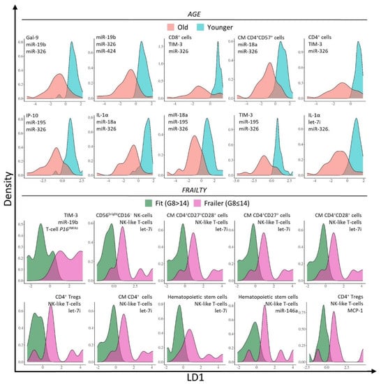 Linear discriminant analysis (LDA) density plots of the blood biomarker panels predicting age and frailty status with the LD1 coordinate on the x-axis and the density on the y-axis. The top 10 highest ranked blood biomarker panels are shown (Table 2). Old patients (≥70 years) are represented in blue, younger patients (35–45/55–65 years) in red, fit patients (G8 > 14) in green and frailer patients (G8 ≤ 14) in purple.
