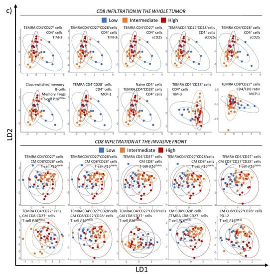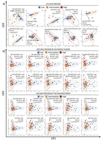 Biomarker combinations were subsequently evaluated for their ability to classify tumors according to their immune infiltration pattern regardless of the age categories. The 10 highest ranked blood three-biomarker panels for sTIL infiltration, CD3 and CD8 infiltration in the whole tumor and invasive front are listed in Table 3 and their LDA score plots are shown in Figure 2a–c. Of note, the top-ranking panels are not necessarily composed of the best performing individual biomarkers identified for the same infiltration variable. The biomarker panels selected for sTIL infiltration had an accuracy of at least 66.7% and L around 40%, the LDA score plots (Figure 2a) show a rather poor separation of the 3 categories (low, intermediate and high sTIL infiltration). The top 10 biomarker panels correlating with CD3 infiltration in the whole tumor had an accuracy of 66.7% and L ranging between 30.2% and 32.7%. In comparison, the biomarker panels correlating with CD3 infiltration in the invasive front had a higher accuracy (up to 76.9%) and slightly lower L (25.6–31.3%). The score LDA plots in Figure 2b show a relatively good separation of low and high CD3 infiltration, although it is hard to distinguish intermediate CD3 infiltrated tumors from either low or highly CD3 infiltrated tumors. Major players in the CD3 infiltration panels were CM CD8+ subsets, T-cell P16INK4a, NK-like T cells, and miR-195 (Table 3). The accuracy of the best biomarker panels for CD8 infiltration in the whole tumor ranged between 66.7 and 70.4% with L between 37.7 and 45.6%. For the invasive front, accuracy of the top 10-biomarker panels ranged between 67.5 and 70.0% with L between 31.3 and 38.6% (Table 3). The score LDA plots for CD8 infiltration (Figure 2c) in the whole tumor show a moderate dissection of the low infiltration category only. Figure 2c also shows a poor separation between the 3 levels of infiltration the invasive front where there is a great deal of overlap.