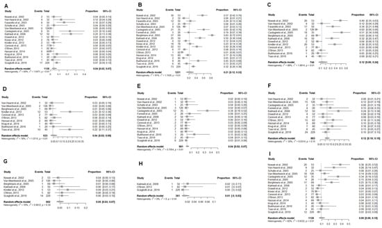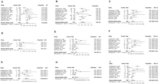 Forest plots demonstrating the toxicity outcomes for platinum/pemetrexed regimen based on toxicity category: (A) Anemia; (B) Neutropenia; (C) Thrombocytopenia; (D) Cardiac Toxicity; (E) Gastro-intestinal toxicity; (F) Fatigue; (G) Infections; (H) Skin toxicity; and (I) Nausea and vomiting. Squares indicate the proportions from individual studies and horizontal lines indicate the 95% confidence interval. The size of the data marker corresponds to the relative weight assigned in the pooled analysis using the random effects model. The diamond indicates the pooled proportion with 95% CI.