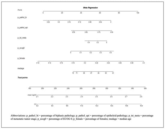There are important limitations to our analysis that should be noted. Formally, any categorical variable should have specific outcome-specific data to optimize the performance of the meta-regression. For example, for gender, male-specific OS and female-specific OS should be calculated. Unfortunately, this was difficult to extract from existing publications, since this level of detail is seldom reported. Similarly, Brims et al. [33] developed a prediction model for MPM using variables like Hb, weight loss, and albumin, which was unable to be extracted from existing publications for this study but would likely improve the performance of the survival estimates. However, in this study, we included percentages as continuous variables in the meta-regression. Furthermore, individual patient-level data can also be used to enhance any created model and should be pursued in subsequent studies. Given this promising approach with study-level data, further projects using individual patient-level data should be performed.