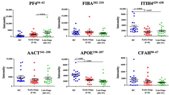 Dot plots of plasma concentrations of selected peptides corresponding to wheat germ agglutinin (WGA)-captured proteins: ADLS*GITGAR (Alhpa-1-antichymotrypsin, AACT341–350), HITSLEVIK (Platelet factor 4, PF454–62), LALDNGGLAR (Inter-alpha-trypsin inhibitor heavy chain 4, ITIH4429–438), LGPLVEQGR (Apolipoprotein E, APOE198–207), QLEQVIAK (Fibrinogen alpha chain, FIBA202–210), and SLGN*VIMVCR (Complement factor H, CFAH58–67) in 20 paired healthy control (HC), early-stage colorectal cancer (CRC), late-stage CRC samples. The intensity was normalized with peak area of spiked Bovine serum albumin (BSA). p < 0.0167 was considered statistically significant.