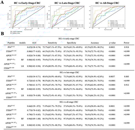 Comparison of receiver operating characteristics (ROC) curves (A) and predictive performance (B) from peptide factor 4 (PF454–62), inter-alpha-trypsin inhibitor heavy chain H4 (ITIH4429–438), apolipoprotein E (APOE198–207), and combinations of the three biomarkers with logistic regression and random forest in healthy controls (HCs) versus early-stage colorectal cancer (CRC), HC versus late-stage CRC, and HC versus all-stage CRC.
