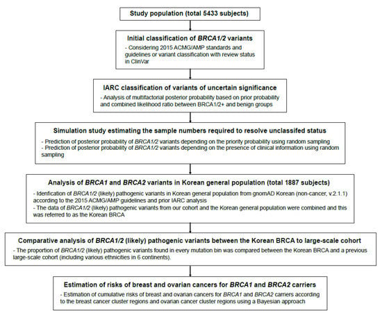 There are two approaches to classifying BRCA1 or BRCA2 genetic variants; one is based on the 2015 American College of Medical Genetics and Genomics (ACMG) and the Association for Molecular Pathology (AMP) standards and guidelines (briefly, 2015 ACMG/AMP) [3], and the other is based on a Bayesian framework set forth by the International Agency for Research on Cancer (IARC) recommendations [4,5]. Recently, the ClinGen Sequence Variant Interpretation Working Group showed that the 2015 ACMG/AMP criteria are compatible with Bayesian statistical reasoning [6]. To date, multiple databases for BRCA1 or BRCA2 genetic variants have been developed [7,8,9]. However, most of the data are based on European populations. Although it has been suggested that cancer risk and genetic variation vary by populations [10,11,12], there is still a lack of research on non-European populations.