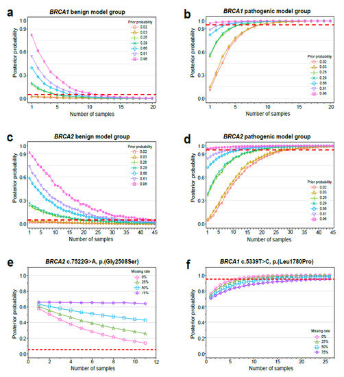Simulation study estimating the sample numbers required to resolve unclassified status. We created two benign and pathogenic datasets, independent from the benign and pathogenic model groups. The benign set contained samples that had only (likely) benign variants according to the 2015 ACMG/AMP or IARC 1/2 variants, while the pathologic set contained samples that had (likely) pathogenic variants or IARC 4/5 variants. A simulation study on the posterior probability in (a) BRCA1 benign model group, (b) BRCA1 pathogenic model group, (c) BRCA2 benign model group, and (d) BRCA2 benign model group. Simulation study on the posterior probability depending on the presence of clinical information (e) at c.7522G>A, p.(Gly2508Ser) in BRCA2 and (f) c.5339T>C, p.(Leu1780Pro) in BRCA1. The prior probability of these two variants was the same at 0.66.