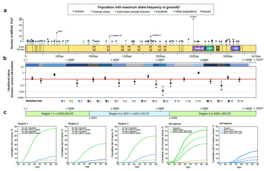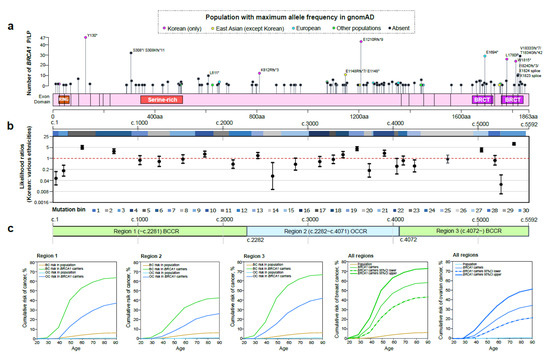 Analysis of pathogenic or likely pathogenic variants in BRCA1. (a) Distribution of pathogenic or likely pathogenic variants (PLPVs) in BRCA1 in the Korean BRCA cohort. The population in gnomAD with maximum allele frequency at individual PLPVs is marked in each color in the circle of lollipop. (b) Comparative analysis of the proportion of BRCA1 PLPVs found in every mutation bin between the Korean BRCA and a large-scale cohort including various ethnicities over 6 continents. The 30 mutation bins across the span of the coding DNA sequence of BRCA1 were constructed using an algorithm in which each mutation bin contained approximately equal numbers of BRCA1 PLPVs in a previous study [21]. (c) Estimation of cumulative risks of breast and ovarian cancers for BRCA1 carriers by mutation region: region 1 (5′ to c.2281, breast cancer cluster regions (BCCR)), region 2 (c.2282 to c.4071, ovarian cancer cluster regions (OCCR)), and region 3 (c.4072 to 3′, BCCR) [21,22]. RING, RING finger domain (24–64) by Pfam (http://pfam.xfam.org/ (accessed on 1 March 2021)); Serine-rich, serine-rich domain associated with BRCT (344–508); BRCT, BRCA1 C Terminus domain (1662–1723, 1756–1842); P/LP, pathogenic or likely pathogenic variants; BC, breast cancer; OC, ovarian cancer.