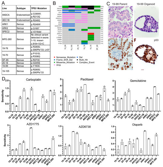 TP53 mutant uterine carcinoma models show varying responses to classic and DNA damage repair targeted therapies. (A) Histologic subtype and TP53 mutation status of six cell lines and six patient-derived organoids analyzed in this study. (B) The most common somatic mutations or copy number alterations identified in six organoid models by targeted panel exome and low pass whole genome sequencing are shown here with the gene name on the left, the percent of organoids with the altered gene on the right, and the key to organoid line and alteration type on the bottom. (C) Hematoxylin and eosin stains of matched parent tumor (top left) and organoid (top right) and p53 immunohistochemistry of the same matched parent tumor (bottom left) and organoid (bottom right). Photos were taken at 63X and then cropped to focus on a single organoid or single tumor region. (D) All organoids and cell lines were tested for sensitivity to gemcitabine, AZD6738, Olaparib, AZD1775, carboplatin, and paclitaxel. All lines were growth rate corrected. The sensitivity (area over the growth rate corrected dose curve) is shown here with bars representing the average sensitivity and error bars representing the standard deviation between two to three replicates.