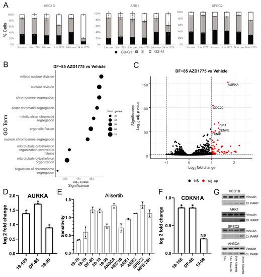 In each line, gene ontology (GO) overrepresentation analysis on post-AZD1775 treatment upregulated genes revealed marked upregulation in G2/M related pathways (Figure 2B and Figure S5) [25], most pronounced in the more responsive lines DF-85 and 19-105. In all three lines, one of the most upregulated genes post-treatment was Aurora kinase A (AURKA) (Figure 2C,D and Figure S5, and Tables S1–S3). Given the G2/M checkpoint deficiency after WEE1 inhibition in ARK1 and SPEC2 (Figure 2A) and the strong upregulation of Aurora kinase after WEE1 inhibition in the most sensitive organoids (DF-85 and 19-105) (Figure 2C,D and Figure S5B), we hypothesized that some TP53 mutant UCs may have issues with late G2/M checkpoint function and be more reliant on Aurora kinase signaling at baseline or when challenged during mitosis. This Aurora kinase dependence may be a targetable vulnerability with the right small molecules.