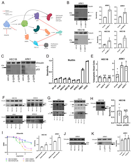 Aurora kinase inhibitor cytotoxicity is mediated in part through the function of mutant p53 and LKB1 signaling. (A) A cartoon demonstrating how Aurora kinase is linked to both the p53/p21 and PI3K/AKT arms of LKB1 kinase signaling. (B) ARK1 and HEC1B cells were transfected with either a control siRNA (si-con) or one of two LKB1 specific siRNAs (si-LKB1-1 or si-LKB1-6) and then treated with a dose range of Alisertib. Western blots showing LKB1 depletion, and p21 upregulation in the case of ARK1, are shown on the left. Two bands were detected, and the top band indicated by an arrow represents the phosphorylated form. Sensitivities (area over the growth rate corrected dose curve) are shown on the right for each cell line with each siRNA. Bars represent the average of three replicates, and error bars represent standard error of the mean. p-values were calculated using a paired t-test. * p < 0.05. (C) Western blots demonstrating p53 depletion in HEC1B and ARK1 with two p53 specific siRNAs (sip53-5 and sip53-7) compared to a control. Two isoforms of p53 are detected, but the top isoform running at 53kDa indicated by an arrow here represents the full length p53 changing with treatment in the remaining figures. (D) A representative subset of TP53 mutant uterine cancer cell lines and organoids along with TP53 wild type human mammary epithelial cells (HMEC) and U2OS cells were treated with a dose range of Nutlin and analyzed for survival. All lines were growth rate corrected, and the sensitivity (area over the growth rate corrected dose curve) is shown here for each line. The bars represent the average sensitivity, and error bars represent the standard deviation for two replicates. (E) HEC1B and ARK1 were transfected with two separate p53-specific siRNAs compared to control (si-con) and analyzed for apoptotic dead cells 72 h later. The average percentage of apoptotic dead cells is shown here with error bars representing the standard error of the mean and p-values generated using a t-test for three replicates. * p < 0.05 and NS = not significant. (F) Cell lines were treated with 0.25 uM Alisertib (Alis) over a 24 h period compared to a 0 h control (con), and lysates were prepared at various timepoints and blotted for full length p53 with vinculin as a loading control. (G) Cell lines were treated with 0.25 uM Alisertib (Alis) over a 24 h period compared to a 0 h control (con), and lysates were prepared at various timepoints and stained for p53 phosphorylated on serine 15 (p53 pS15). Loading controls included vinculin, GAPDH, and p53. An arrow indicates the 53kDa molecular weight band that represents full length p53 and is phosphorylated and changing with treatment. (H) HEC1Bs were stably transfected with empty vector or a dominant negative p53 (p53DD) and then treated with a dose range of Alisertib. A western blot for p53 is shown on the left, showing the overexpressed protein correctly running at 53kDa, and the sensitivity (area over the growth rate corrected dose curve) for Alisertib is shown on the right. Bars represent the average of three replicates, and error bars represent the standard error of the mean. p-values were generated using a t-test comparing vector to p53DD. NS = not significant. (I) ARK1 and HEC1B cells were treated with a dose range of Alisertib in combination with either a fixed dose of DMSO or a fixed dose of 5 uM Nutlin. Representative growth rate corrected dose curves are shown on the left with a key to treatments/cell lines on the bottom, and the sensitivity (area over the growth rate corrected dose curve) for both lines is shown on the right. Bars represent the average of three replicates, and error bars represent standard error of the mean. p-values were calculated using a paired t-test comparing vehicle-Alisertib to Nutlin-Alisertib. * p < 0.05. (J) ARK1 cells were tested for p21 upregulation after 0.25 uM Alisertib (Alis) treatment over a 24 h period. An untreated control (con) was harvested at 0 h. p21 expression was studied by western blot over the time course with vinculin as a loading control. (K) ARK1 cells were transfected with either a control siRNA (si-con) or one of two p21 specific siRNAs (si-p21-1 or si-p21-4) and then treated with a dose curve of Alisertib. On the left is a western blot for p21 in the control or p21 depleted cells with vinculin as a loading control. On the right is the sensitivity (area over the growth rate corrected dose curve) for the growth rate corrected dose curves of the cells. Four replicates were performed with each siRNA. Error bars represent the standard error of the mean, and p-values were generated using a t-test comparing si-con to gene specific siRNAs. * p < 0.05.