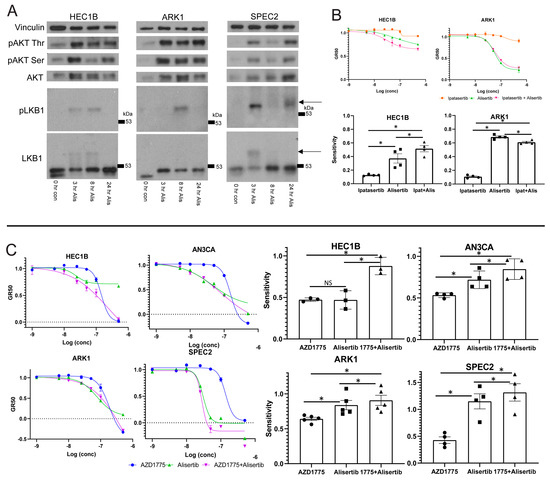 Our next question was whether or not the AKT arm of LKB1 signaling was inhibited by or is actively involved in the Alisertib response, especially since there are mutations in members of this pathway in most of our models (Figure 1B) [20,23]. LKB1 and AKT activation require phosphorylation [18,48], and we hypothesized that if Alisertib induced death relies upon LKB1–AKT signaling, there may be differences in the activation of this pathway in Alisertib resistant versus sensitive cells. Accordingly, we assessed phosphorylated LKB1 or AKT upregulation after Alisertib treatment in multiple UC lines (Figure 4A). In Alisertib resistant HEC1B and sensitive SPEC2 and ARK1, phosphorylated LKB1 and AKT reproducibly increased at various timepoints between three and 24 h after Alisertib treatment. In addition, AKT was phosphorylated to a lesser extent at baseline in all three lines (Figure 4A), reflecting its potential baseline activation by alterations in the pathway which are common in UC [20,23]. Taken together, this indicated that LKB1–AKT signaling was already active at baseline possibly serving some protective function, upregulated in response to Alisertib, and intact to the point of AKT phosphorylation in all UC lines tested. Our next question was whether the upregulated AKT was active in the cellular response to Alisertib.