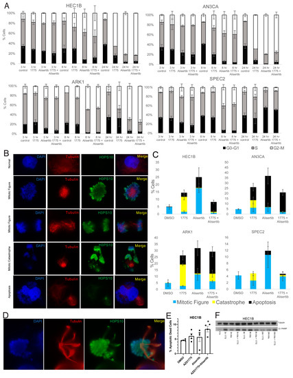 To better assess mitotic figure formation, mitotic catastrophe, or apoptotic blebbing post-treatment, AN3CA, ARK1, SPEC2, and HEC1B were treated with vehicle, Alisertib, AZD1775, or Alisertib+AZD1775 and stained for H3pS10 to mark mitosis and tubulin to mark mitotic spindles 24 h after treatment. Cells with normal or Alisertib altered mitotic figures, mitotic catastrophes, and apoptotic blebs were counted in each setting (Figure 5B–D). Alisertib altered mitotic figures demonstrated distinct spindle formations and never revealed anaphase forms (Figure 5D). Overall, the result for each treatment fit what was expected for the treatment and checkpoint function background.