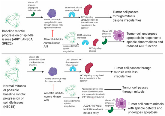 Key to discovering this mechanistic defect was functional assessment of G2/M cell cycle checkpoints across a panel of TP53 mutant models. Our data indicate that at baseline many TP53 mutant UC cells, represented here by ARK1, AN3CA, and SPEC2, harbor difficulties with G2/M checkpoints and mitosis yet survive due to a combination of mutant p53 protein function and upregulation of Aurora kinase–LKB1–p53–AKT signaling (Figure 2, Figure 3, Figure 4, Figure 5 and Figure 6). Alisertib treatment generates increased altered mitotic figures in these already G2/M checkpoint defective cells (Figure 5C,D). Simultaneously, it alters the LKB1–p53–AKT signaling they normally rely upon to progress through mitosis with these defects, in tandem leading to apoptotic cell death (Figure 6). In contrast, in other TP53 mutant UC cells, represented by HEC1B, there is an intact G2/M checkpoint that handles mitotic irregularities appropriately at baseline regardless of LKB1–AKT pathway status (Figure 2A, Figure 5A,C, Figure 6, and Figure S6B). In the setting of Aurora kinase inhibition in these cells, altered mitoses may form, but the intact checkpoint allows the cells to repair these issues without as much baseline reliance on AKT signaling (Figure 5A,C and Figure 6). We show that combining WEE1 and Aurora kinase inhibition in these cells allows for altered mitoses to form and forces them to progress in mitosis leading to apoptotic cell death (Figure 4C, Figure 5, and Figure 6). This mechanism driven combination may be effective not just in uterine but potentially in TP53 mutant ovarian cancer as well, where Alisertib has been tested as a single agent or in combination with paclitaxel with some success [39]. Understanding the functional defects (e.g., G2/M checkpoint) or essential drivers (e.g., AKT/PI3K) in every unique tumor to identify the best combinations will be critical in further studies.