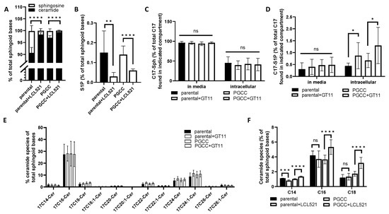 Steady-state and flux analysis of sphingolipids by LC/MS in parental and PGCC. (A) Steady-state LC/MS analysis to show differences sphingosine and ceramide content in PPC1 and PPC1-PGCC in the absence or presence of 5 μM LCL521. (B) Steady-state LC/MS analysis of S1P from data sets used in (A). (C–E). LC/MS analysis of 17C-Sph added for 30 min in the absence or presence of GT-11. (C) 17C-Sph detected in as a percentage of total in media or cells. (D) 17C-S1P detected in as a percentage of total in media or cells. (E) Distribution of 17C-ceramides detected in as a percentage of total intracellular 17C. (F) Steady-state LC/MS analysis of ceramide species in the absence or presence of 5 μM LCL521 for 5 h. Data are from three independently performed experiments each with triplicate samples. ANOVA was used to evaluate overall differences across groups with multiple conditions followed by Student’s t-test to further analyze specific differences. * p < 0.05, ** p < 0.01, *** p < 0.001, **** p < 0.0001. ns = not significant.