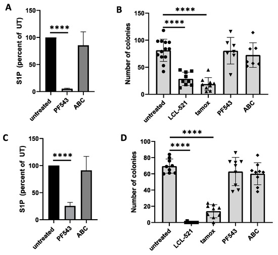 Effects of sphingosine kinase inhibition of S1P and colony formation from PGCC. S1P levels in the absence or presence of sphingosine kinase inhibitors in PPC1 (A) or MEL624 cells (C). Data are from two independently performed experiments with triplicate samples. Colony formation of PGCCs in the absence or presence of ASAH1 or sphingosine kinase inhibition in PPC1 (B) or MEL624 cells (D). Inhibitor concentrations were 5 μM for LCL521 or tamoxifen and 10 μM for PF543 or ABC294640. ANOVA was used to evaluate overall differences across groups with multiple conditions followed by Student’s t-test to further analyze specific differences. **** p < 0.0001. The symbols in panels (B,D) represent individual data points that were used to calculate the average and standard deviation.