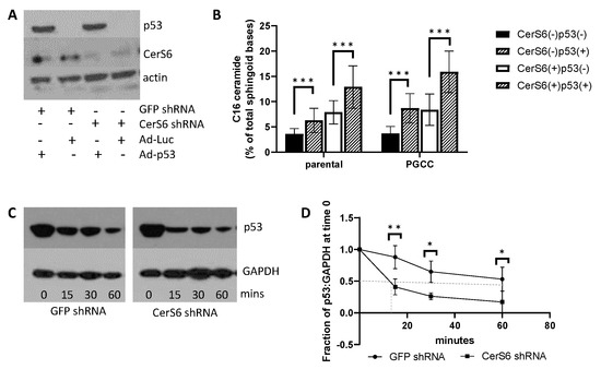 Since we were unable to establish a role for S1P and sphingosine kinases in PGCC, we focused on the potential role of C16-ceramide in preventing progeny formation. C16-ceramide levels were modulated directly through knockdown or overexpression of CerS6 [23,24]. We also modulated C16-ceramide levels indirectly though p53. Loss of p53 is important for polyploidy and tumorigenicity but the role of sphingolipids in these processes is unknown [25,26,27]. The Krupenko laboratory recently identified a positive feedback loop in which C16-ceramide serves as an activator of p53 by stabilizing the protein through direct interaction with the DNA binding domain, and p53 in turn transcriptionally activates CerS6, which preferentially generates C16-ceramide [28]. PPC1, which are derived from PC3 cells, lack p53 protein expression due to loss of one allele and a truncating mutation in the other [29]. We hypothesized that expressing low, non-apoptotic levels of wildtype p53 could be used to indirectly increase intracellular C16-ceramide. To isolate the role of the p53/CerS6 feedback loop from any general effects of p53, we performed assays in parallel with targeting CerS6 by shRNA. Modulation of gene expression is shown in Figure 3A, and the corresponding C16-ceramide levels are quantified in Figure 3B, with the effects on all ceramides shown in Figure S4. Cells lacking CerS6 and p53 have the lowest levels of C16-ceramide, whereas cells expressing both genes have the highest levels of this ceramide species. Next, we confirmed that the virally transduced wildtype p53 is stabilized by C16-ceramide and found that the p53 half-life is dramatically shortened from over 60 min to under 15 min in the reduced C16-ceramide environment found in cells expressing the CerS6 shRNA (Figure 3C,D).