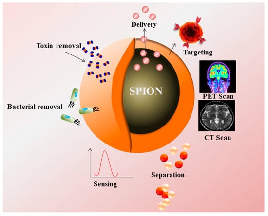 Superparamagnetic nanoparticles (SPIONs) as a contrast agent in PET, CT Scan, and their applications in targeting, drug delivery, removal of toxin, bacteria, and sensing.
