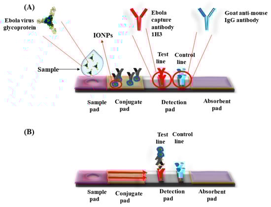 Lateral flow dipstick device for the detection of Ebola virus using Iron oxide nanoparticles (IONPs). (A) Ebola capture antibody 1H3 coated on test line and control line coated with goat anti-mouse IgG antibody. Sample was applied in the sample well. (B) The sample runs via capillary action on the membrane. Presence of specific antigen for Ebola developed color in the detection pad.