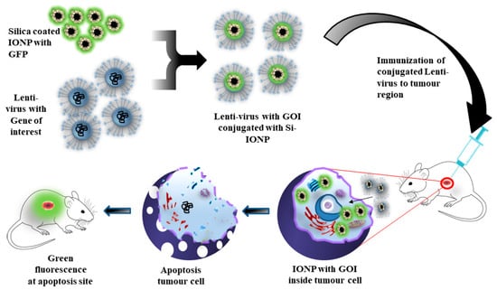 Silica-coated IONPs conjugated with lentiviral vector delivered the gene of interest at the targeted tumor region, and verified via green fluorescence, and cellular apoptosis at the tumor region.