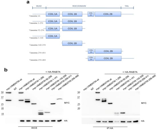 RAB7A interacts with the coil1 domain of vimentin. (a) scheme representing the structure of wild type vimentin and its deletion mutants constructed for testing the interaction with RAB7A. (b) hemagglutinin (HA)-tagged RAB7A and wild type or mutated myc-tagged vimentin proteins were expressed in HeLa cells as indicated. Immunoprecipitation (IP) has been performed using an anti-HA resin. Immunoprecipitates were subjected to Western blot analysis using anti-myc and anti-HA antibodies. Expression of the proteins of interest in the lysate before performing co-IP has been tested (Whole-Cell extract (WCE)).
