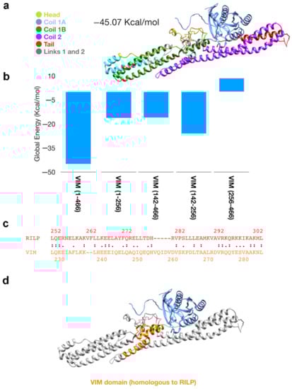 Interestingly, a homology search revealed that a string of about fifty amino acid in the coil1B domain of vimentin displays 30% of identity and 52% similarity with the RAB7A-interacting domain of Rab interacting lysosomal protein (RILP), described previously [38]. Moreover, the first 30 amino acids of this string display 30% of identity and 70% of similarity with the RILP domain (Figure 2c). In Figure 2d, the vimentin domain similar to the RILP domain interacting with RAB7A is depicted.