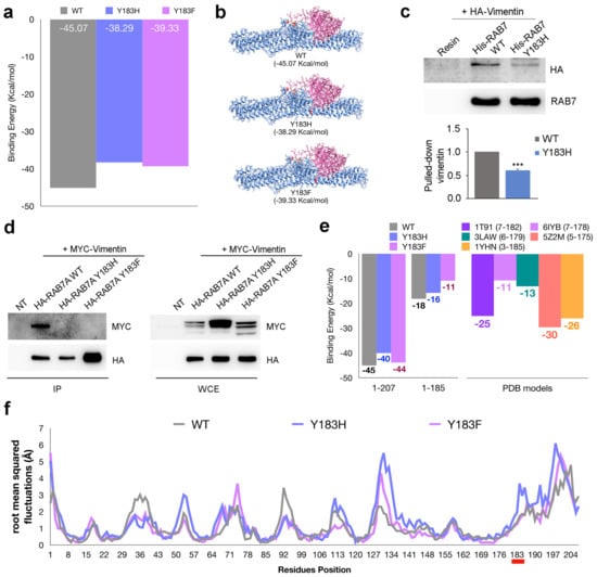 Interaction between vimentin and the RAB7AY183 mutant proteins. (a) results of docking between vimentin and wild type or mutated RAB7A. (b) 3D structure of the complexes between vimentin and RAB7A wild type, Y183H or Y183F obtained by Gramm-X docking simulations. (c) bacterially expressed and purified His-tagged RAB7A wild type and Y183H were incubated with total extracts of HeLa cells overexpressing HA-vimentin and pulled down with Ni-NTA resin. Proteins were subjected to Western blot analysis using anti-HA and anti-RAB7A antibodies. Quantification of pulled-down vimentin is shown. Data represent the mean ± s.e.m. of three independent experiments. *** = p < 0.001. (d) HA-tagged RAB7A wild type, Y183H or Y183F and myc-tagged vimentin wild type proteins were expressed in HeLa cells. IP has been performed using anti-HA resin. Immunoprecipitates were subjected to Western blot analysis using anti-myc and anti-HA antibodies. Protein expression in the lysates before performing co-IP has been checked (WCE). (e) Left: results of simulations of Gramm-X docking using RAB7A complete models (1-207) and RAB7A truncated models (1-185); Right: results of PatchDock simulations using as ligands different models of RAB7A downloaded from the PDB (RSCB) database. In the legend start and stop residues for each model are shown. (f) fluctuation plots obtained performing CABSflex analysis on RAB7A wild type and Y183H and Y183F mutant models.