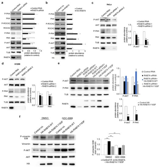 RAB7A regulates AKT kinase activity, PAK1 abundance, and vimentin phosphorylation. (a) HeLa cells were transfected with either control RNA or RAB7A siRNA and then lysed after 5 days or (b) transfected with plasmids encoding either HA or HA-RAB7A and lysed after 24 h. Lysates were subjected to Western blot analysis using the indicated antibodies. (c) HeLa or (d) H1299 cells were treated with control RNA or with RAB7A siRNAs and lysed after 5 days. Lysates were subjected to Western blot analysis using the indicated antibodies. Quantifications of total PAK kinase and phosphorylated AKT kinase are shown. (e) HeLa cells were treated with control RNA or with RAB7A siRNA or transfected with plasmids coding for HA or HA-RAB7AY183F. RAB7A-silenced cells were also transfected with plasmids encoding HA-RAB7A WT or Y183F to rescue RAB7A function. Lysates were subjected to Western blot analysis using the indicated antibodies. Quantification of phosphorylated AKT and PAK1 kinases was shown. (f) HeLa cells were transfected with plasmids encoding either HA, HA-RAB7AWT, or HA-RAB7AY183F. 24 h after transfection cells were incubated with the AKT inhibitor GDC-0068 1 µM or DMSO for 24 h and then lysed. Lysates were subjected to Western blot analysis using the indicated antibodies. Quantification of P-vimentin Ser38 is shown. All data represent the mean ± s.e.m. of at least three independent experiments. * = p < 0.05; ** = p < 0.01; *** = p < 0.001.