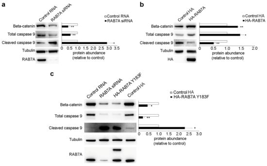 AKT and PAK are both implicated in apoptosis since activation of these kinases prevents the processing of procaspase-9, enhancing survival [43,44]. Thus, we also investigated if modulation of RAB7A expression affects caspase 9 cleavage and we found a reduction in caspase 9 total abundance accompanied by increased cleavage of this caspase upon RAB7A silencing (Figure 5a). Consistently, we observed increased caspase 9 abundance and reduced cleavage in RAB7A overexpressing cells (Figure 5b). Moreover, to test the effects of the RAB7AY183F mutant protein, we transfected HeLa cells with plasmids encoding HA or HA-RAB7AY183F and we analyzed the abundance of beta-catenin and of the total and cleaved caspase 9. As shown in Figure 5c, the presence of the RAB7A mutant protein caused reduced expression of beta-catenin and procaspase-9 and increased caspase 9 cleavage, similarly to the effects produced by RAB7A silencing (Figure 5c).