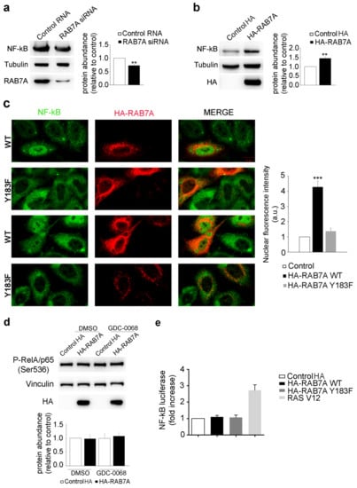 NF-kB can be phosphorylated at serine 536 in the transactivation domain (TAD) by several kinases and this modification leads to increased transactivation [48]. Among these kinases, IκB (Inhibitor of NF-kB) kinase α (IKKα) is phosphorylated by AKT and, once activated by AKT, it phosphorylates the IκB protein and also p65/RelA, inducing increased activation of NF-kB [46]. To test if RAB7A overexpression affects NF-kB phosphorylation, we performed a Western blot analysis using an antibody that recognized p65/RelA phosphorylated at serine 536. As shown in Figure 6d, NF-kB phosphorylation does not change in RAB7A overexpressing cells, suggesting that RAB7A does not affect NF-kB activation. To further investigate this issue, we performed a luciferase assay, which revealed that neither RAB7AWT nor RAB7AY183F could stimulate NF-kB-dependent transcription, a result instead obtained with the positive control Ras V12 (Figure 6e).