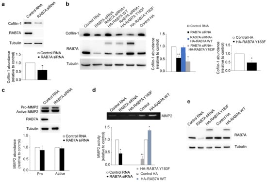 A recent work showed that cofilin-1 depletion suppresses cell migration and decreases MMP2 activity [51]. Having demonstrated that RAB7A silencing affects cofilin-1 abundance, we evaluated MMP2 expression and activity in HeLa cells upon RAB7A silencing. We did not find any differences in MMP2 protein levels between cells transfected with control RNA or RAB7A siRNA (Figure 7c), but when we analyzed MMP2 activity by gelatin zymography, we observed reduced activity of this enzyme in RAB7A-depleted cells (Figure 7d,e). Furthermore, while the expression of HA-RAB7AWT increased MMP2 activity, the opposite effect was caused by HA-RAB7AY183F which reduced MMP2 activity by about 75% compared to control cells (Figure 7d).