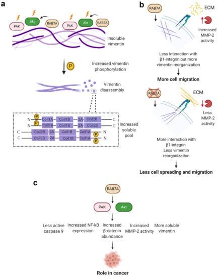 RAB7A regulation of vimentin assembly and of several AKT and PAK effectors. (a) RAB7A interacts with vimentin and activates AKT and PAK which in turn phosphorylate vimentin head domain. This increased phosphorylation leads to the disassembly of vimentin filaments in soluble tetramers made of two antiparallel dimers. (b) expression of RAB7A leads to vimentin filaments reorganization, increased MMP2 activity, and faster cell migration (top), whereas depletion of RAB7A determines alteration of vimentin filaments reorganization, reduced MMP2 activity, and slower cell migration (bottom). (c) schematic overview of RAB7A regulation on AKT and PAK kinases and their downstream effectors in cell migration, apoptosis, and cancer. Created with Biorender.com (accessed on 1 April 2021).