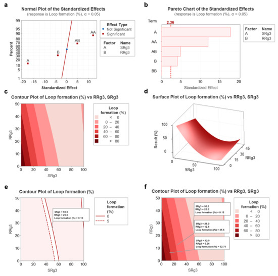 The calculated results of the response surface methodology developed using the central composite design technique for the optimisation of SRg3 and RRg3 drugs. (a) Standardised effect chart showing the critical parameters that need to be investigated, (b) Pareto chart analysis for loop formation data that reflects the effectiveness of each parameter, (c) contour plot, (d) surface plot for the percentage of loop formation following a combination of SRg3 or RRg3, (e) contour plot highlighting the area with the best efficacy for the combination, and (f) contour plot showing the predicted responses of two other combination treatments. A and B stand for SRg3 and RRg3, respectively, and AB represents the combination of SRg3 and RRg3. AA and BB show a mathematical expression of high concentrations of SRg3 and RRg3, respectively.