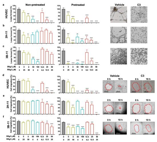 In non-pretreated HUVEC, only SRg3 inhibited cell migration by 66% and 80% for 50 and 100 µM, respectively (p < 0.0001; Figure 2d). C1, C2, and C3 inhibited loop formation dose-dependently by 16%, 75% (p < 0.0001), and 89% (p < 0.0001), respectively (Figure 2d). 2H-11 and 3B-11 were not sensitive to single epimers, but the C2 (p < 0.001) and C3 (p<0.0001) significantly inhibited cell migration. A three-day exposure of the cells with the drugs increased the effects of single drugs. In HUVEC, the inhibitory effects of RRg3 increased and both concentrations of SRg3 completely inhibited migration (p < 0.0001). In 2H-11, the inhibitory effects of higher concentrations of SRg3 and RRg3 increased, while in 3B-11, the effects of all single epimers were increased. In both cell lines, C3 almost completely inhibited cell migration (Figure 2e,f). This experiment also showed time- and dose-dependent inhibition of migration by Rg3 epimers and confirmed the results of Rg3 in the loop formation assay.