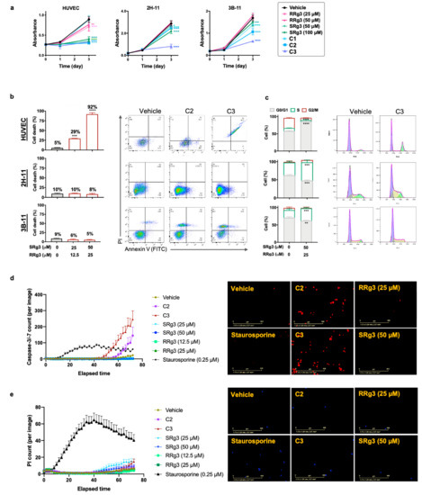 The induction of cell death was studied by staining the cells with annexin V and propidium iodide (PI; Figure 3b). In HUVEC cells, C2 and C3 induced about 29% (p = 0.0003) and 92% (p < 0.0001), respectively, cell death after three days of treatment. The cell death induced by C3 was associated with G0/G1 arrest in HUVEC (p < 0.0001; Figure 3c). Further studies showed that C2 and C3 induced the activation of caspase 3/7 in HUVEC by 536% and 980%, respectively (Figure 3d), with subsequent increases in the number of PI-positive cells (Figure 3e), consistent with late apoptosis. Interestingly, single epimers of Rg3 did not induce caspase activation in HUVEC. This shows that SRg3 and RRg3 in C2 and C3 combinations play a synergistic role in the induction of apoptosis in this cell.