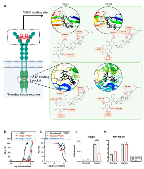 Given the observed effects of Rg3 in this system and the results obtained from the molecular docking, it seems probable that Rg3 is an allosteric modulator of VEGFR2. In the absence of VEGF, as the primary ligand, SRg3 and RRg3 had a minimum activity on the receptor, while in the presence of VEGF, Rg3 epimers decreased the efficacy of VEGF-VEGFR2 interactions potentially by changing the conformation of the receptor. Furthermore, the efficacy of C3 on the VEGF expression in normoxic and hypoxic conditions in HUVEC and MDA-MB-231 cells was studied (Figure 4d,e). C3 did not have any significant effect on VEGF expression in MDA-MB-231 (Figure 5e), but in hypoxic HUVEC cells, when the expression of VEGF was significantly increased in vehicle-treated cells, Rg3 decreased this expression (p = 0.0008; Figure 4d).