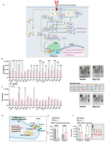 (a) A schematic diagram of the signaling of the downstream activation of a receptor tyrosine kinase, leading to cell survival, proliferation, migration, angiogenesis, and metabolism (created with BioRender.com (accessed on 11 March 2021)). The effects of C3 (50 µM SRg3 + 25 µM RRg3) on the phosphorylation of signaling proteins in PI3K/AKT signaling in HUVEC cells grown in (b) normoxia and (c) hypoxia (1% O2) conditions. The cells were exposed with C3 for three days. The data show the mean ± SD of two replicates with p < 0.05. (d) A schematic diagram of the role of AQP1 localised in the leading edge of an endothelial cell facilitating cell migration (reviewed in [9]) (created with BioRender.com). The cells were exposed with C3 for thee days in normoxic or hypoxic (1% O2) conditions. Expression levels of (e) AQP1 transcripts measured with QT-PCR or (f) proteins detected using the Western blotting technique in normoxic and hypoxic conditions are shown. The data represent the mean ± SD of three replicates with p < 0.05. * p < 0.05, ** p < 0.01, *** p < 0.001 and **** p < 0.0001.
