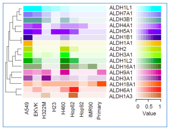 Expression of ALDH isoforms in lung cancer cell lines was measured by multiple reaction monitoring mass spectrometry (MRM-MS) [3].