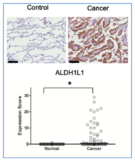 Representative immunohistochemical staining of ALDH1L1 in normal and cancerous lung tissue. Scale bar = 100 μm. Expression of ALDH1L1in cancerous (cancer) and normal lung type I and II pneumocytes (control). ★ p < 0.001, n = 57 for each case [3].