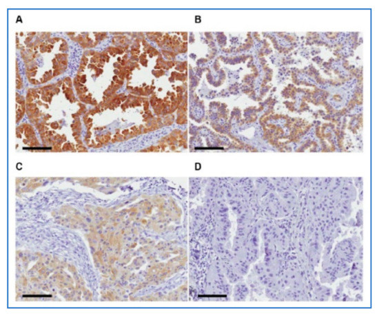 Supplementary Figure S1: Expression pattern of ALDH1L1 in lung cancer. (A) strong expression (B) moderate expression. (C) weak expression. (D) negative expression. Scale bar = 100 μm.