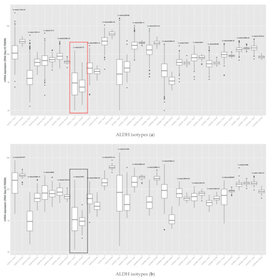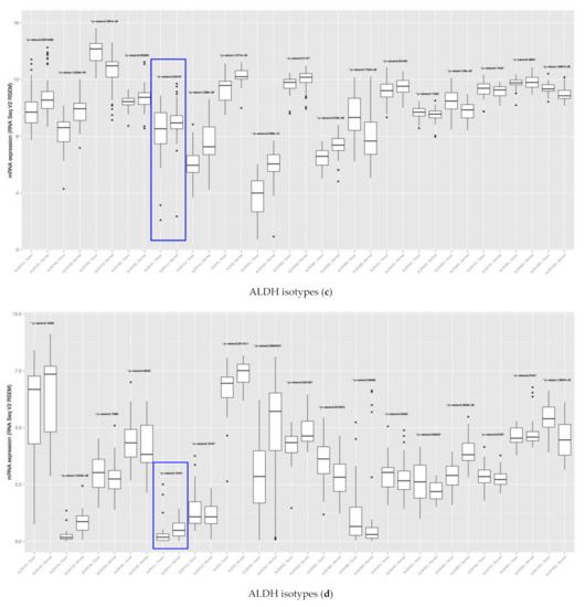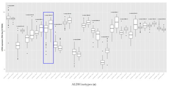 To investigate the gene expression level of all ALDH isotypes of human cancers, we downloaded mRNA gene expression of The Cancer Genome Atlas (TCGA) from UCSC cancer genomics browser (https:genome-cancer.ussc.edu (accessed date: 13 December 2020) [4]). Here, we showed the boxplots of a few cancers’ ALDH isotypes (a: lung adenocarcinoma, b: lung squamous cell carcinoma, c: prostate adenocarcinoma, d: stomach adenocarcinoma, e: renal clear cell carcinoma). We demonstrated that the ALDH1L1 gene expression level of cancer samples is higher than that of normal samples in non-small cell lung cancer (a. NSCLC).
