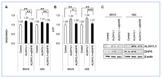 Effect of ALDH1L1 over expression on induction of NADH and ATP production. (A–C) EKVX and H23 cells were transfected with plasmid expressing ALDH1L1 for 24 h and incubated with siRNA of DHFR for 24 h [3]. ★ p < 0.05, ★★ p < 0.01, ★★★ p < 0.001