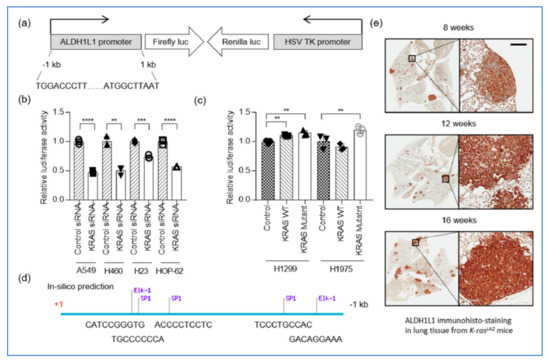 ALDH1L1 is a target of oncogenic KRAS. (a) Schematic representation of the reporter construct used in the cell-based transduction system. This lentiviral reporter construct expressed firefly luciferase under the control of the ALDH1L1 promoter and Renilla luciferase under the control of the HSV TK promoter. (b) KRAS-mutant NSCLC cells stably expressing the reporter system described in (a) were treated with control or KRAS siRNA. Firefly and Renilla luciferase activities were normalized against the corresponding levels in the sample transfected with control siRNA. Bars show relative luciferase activity (n = 3). (c) KRAS WT NSCLC cells stably expressing the reporter system described in (a) were transfected with control (empty vector), KRAS WT, or KRAS mutant (G12D). Firefly and Renilla luciferase activities were normalized against the corresponding levels in the sample transfected with empty vector. Bars indicate relative luciferase activity (n = 3). (d) In silico prediction of binding sites for transcription factors downstream of KRAS: SP1, transcription factor Sp1; Elk-1, ETS Like-1 transcription factor. (e) Immunohistochemical staining of ALDH1L1 in lungs isolated from KrasLA2 mice at 8, 12, and 16 weeks of age. The scale bar represents 200 mm (** p < 0.01, *** p < 0.001 and **** p < 0.0001) [1].