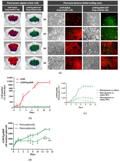 Drug-sensitive A549 clones inhibit the proliferation of the drug-resistant A549/EpoB40 clones. (a) Representative fluorescent signal using a well-scanning mode microplate reader (left panel) and microscopic pictures (right panel; magnification factor ×10) of A549-DsRed drug-sensitive and A549/EpoB40-GFP drug-resistant cells over time. (b) Cell number of A549 and A549/EpoB40 by recording fluorescent signals (DsRed and GFP) over time. Data were expressed as a percentage of cell number from day 0. (c) Fluorescent signal of A549/EpoB40 cells over time in homogeneous or heterogeneous 2D co-culture systems. (d) Relative A549/EpoB40 cell numbers in 3D hetero-spheroids and homo-spheroids measured by fluorescent signal over time. Data are shown as mean ± SEM. * p < 0.05; *** p < 0.001.