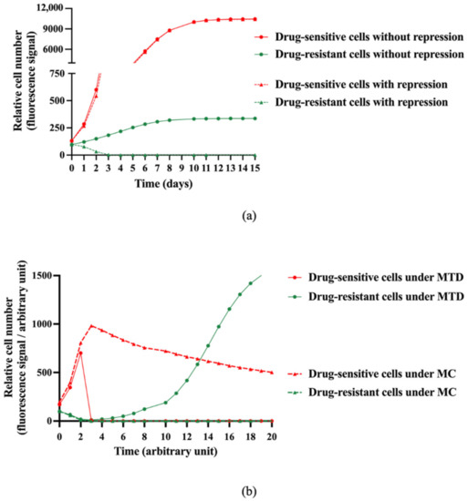Model-based in silico simulation of the interaction between sensitive and resistant clones with or without treatment. (a) Model-based in silico simulations of relative drug-sensitive and drug-resistant cell proliferation over time with or without a repressive effect exerted by the drug-sensitive cells over the drug-resistant ones. (b) In silico simulations of relative drug-sensitive and drug-resistant cell proliferation under MTD (Maximum Tolerated Dose) and MC (Metronomic Chemotherapy) schedules and taking into account the suppressive effect of the drug-sensitive cells over the drug-resistant ones (β > 0 in the model).