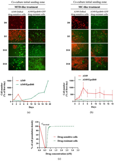 To obtain heterogeneous co-culture spheroids in 96-well round bottom plates, drug-resistant cells were resuspended with drug-sensitive cells at the same ratio as the 2D co-culture models in a volume of 100 μL culture media, supplemented with 20% of methylcellulose (Sigma-Aldrich, Lyon, France). The control 3D structures (homogeneous co-cultures) included A549/EpoB40-DsRed with A549/EpoB40-GFP cells, in the same proportions as the heterogeneous structures. After 48h, spheroids were treated following MC (0.5 nM patupilone or 0.2 µM oxaliplatin) and MTD treatment schedules (5 nM patupilone or 2 µM oxaliplatin). Resistant cell growth within the 3D structures was analyzed daily by recording the fluorescent signals as described for 2D co-cultures. Each signal was then converted into a number of resistant cells present in the structure, via a range of calibration carried out previously with 3D spheroids made of 500 to 150,000 A549/EpoB40-DsRed cells.