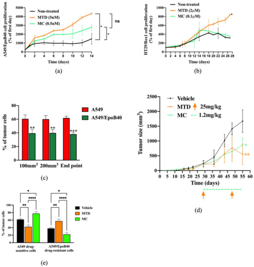 Biological validation of the mathematical model predictions in 3D spheroid and in vivo models. (a,b) Cell proliferation of A549/EpoB40 (a) and HT29/rox1 (b) drug-resistant cells by recording fluorescent signals over time under MTD (patupilone 5 nM (a) or oxaliplatin 2 μM (b)) or MC (patupilone 0.5 nM (a) or oxaliplatin 0.1 μM (b)) schedules. Data were expressed as a percentage of cell proliferation from day 0. (c) Ex vivo tumor cell composition at three different time points in the untreated condition. Fluorescent cell signals were quantified by flow cytometry. (d) Tumor sizes were measured over time in the untreated condition as well as under MTD (paclitaxel at 25 mg/kg, once every 3 weeks) and MC treatment (paclitaxel 1.2 mg/kg, daily). Significant differences compared to vehicle were observed. Orange arrows represent MTD-drug administration, while the dotted green line indicates the MC-drug administration period. (e) Ex vivo tumor cell composition at the end point in the untreated condition and following MTD-like and MC-like treatment schedules. Fluorescent cell signals were quantified by flow cytometry. Data are expressed as a percentage of drug-sensitive and drug-resistant cell populations and are shown as mean ± SEM. * p; ** p < 0.01; *** p < 0.001; **** p < 0.0001.