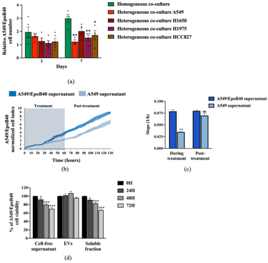 It is now well-known that indirect cell–cell communication could play a key role in cancer [16]. To investigate whether the drug-sensitive NSCLC clones could exert their suppressive effect on the drug-resistant ones without direct cell interaction, we used Transwell® systems of heterogeneous co-cultures. Our results demonstrated that in a homogeneous co-culture, A549/EpoB40 cells continuously grew over time (Figure 5a). However, drug-resistant cell proliferation could be inhibited by indirect interaction with the drug-sensitive cells (Figure 5a). This repressive effect was not specific to A549 cells as similar results were obtained with H1650, H1975 and HCC827 NSCLC cell lines (Figure 5a). We further analyzed the effect of conditioned media using cell-free supernatants on the drug-resistant A549/EpoB40 cell growth by real-time impedance measurement. Our results showed a decrease in the proliferation of drug-resistant A549/EpoB40 cells treated with drug-sensitive A549 supernatants in comparison to treatment with the drug-resistant A549/EpoB40 supernatants (Figure 5b, grey-shaded area). This was reflected by a significant drop in the A549/EpoB40 cell growth curve slope treated with the A549 supernatant condition of 56 +/−3% (p < 0.01), demonstrating an indirect interaction between the two cell clones (Figure 5b,c). Moreover, the discontinuation of exposure to drug-sensitive A549 supernatants led to a recovery of the drug-resistant A549/epoB40 cell proliferation (Figure 5b, white-shaded area), as indicated by the same slopes for both cell populations (Figure 5c). As it has recently become apparent that secreted extracellular vesicles (EVs) are proficient intercellular communication mediators [17], we separated vesicles from the soluble fraction of drug-sensitive A549 cell-free supernatants by sequential centrifugations and analyzed their effect on drug-resistant A549/EpoB40 cell growth. The vesicles we extracted were exosomes based on their diameter, ranging from 50 to 200 nm, as previously described [18]. Our results showed that treatment with a soluble fraction from drug-sensitive A549 cells significantly decreased the drug-resistant A549/EpoB40 cell viability over time as did A549 cell-free supernatant treatment, in agreement with the impedance results (Figure 5d). In comparison, EVs fraction did not significantly impact the drug-resistant A549/EpoB40 cell viability (Figure 5d). Collectively, our data indicate that drug-sensitive A549 clones can control the proliferation of drug-resistant A549/EpoB40 clones through an indirect cell–cell communication, independently of exosome secretion.