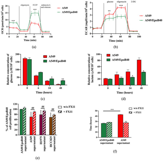 Drug-sensitive A549 clones have a higher glycolytic profile than drug-resistant A549/EpoB40 clones. (a,b) A549 and A549/EpoB40 cells were analyzed for (a) mitochondrial bioenergetics and (b) glycolysis using the Seahorse XF technology (OCR: Oxygen Consumption Rate and ECAR: ExtraCellular Acidification Rate). (c,d) Supernatants from A549 and A549/EpoB40 were collected over time and analyzed for (c) glucose consumption and (d) lactate production by using the YSI 2900 instrument. (e) A549/EpoB40 cell proliferation was measured by crystal violet assay at 72 h after daily exposition to cell-free supernatants from A549, H1975 or HCC825 cultures previously incubated with or without 3 µM of FX11. Supernatants from A549/EpoB40 cultures that were subjected to the same treatment were used as a control. Results were expressed as a percentage of control cell proliferation. (f) A549/EpoB40 cell growth was followed by a real-time impedance-based method. A549/EpoB40 cells were exposed daily to cell-free supernatants from A549 and A549/EpoB40 cultures that were previously incubated with or without 3 µM of FX11. Doubling time of A549/EpoB40 cells was calculated in different conditions. Data are shown as means ± SEM. * p < 0.05; ** p < 0.01; *** p < 0.001; ## p < 0.01 (* comparison to A549/EpoB40 supernatant w/o FX11 and # comparison between w/o FX11 and FX11 treated conditions).