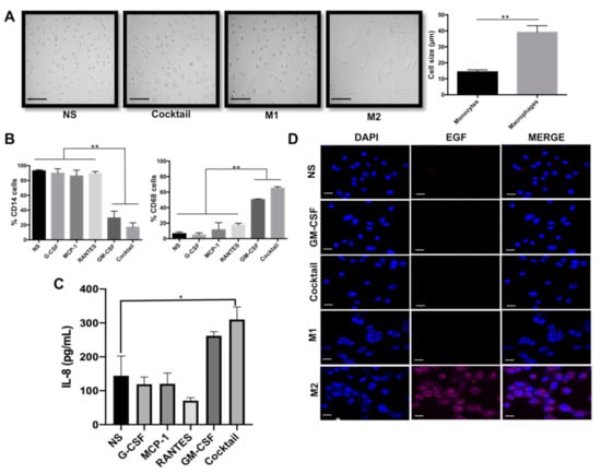 GM-CSF, G-CSF, MCP1, and RANTES promote peripheral blood monocytes (PBMs) differentiation into M1-like macrophages. PBMs were treated with the four cytokines individually or with a cocktail of all of them for six days. (A) Monocyte and macrophage morphology (left) and size plot (right) obtained without (NS) or with stimulation with the four cytokines, respectively. The scale bars indicate 100 μm, magnification 100×. (B) Flow cytometry of CD14 and CD68 expression. (C) IL-8 expression was determined by sandwich ELISA. (D) EGF expression was evaluated by immunofluorescence (EGF (magenta) and nuclei (blue)). The scale bars indicate 20 μm, magnification 60×. Macrophages induced with either GM-CSF/LPS/IFNγ (M1) or M-CSF/IL-4/IL-13 (M2) were included for comparison. NS are the non-stimulated PBM cultured six days with medium and 6% FBS. Data represent the mean ± SEM (standard error of the mean) from three independents experiments. Un unpaired Student’s t-test was used in (A) ** p < 0.01, and a non-parametric Kruskal–Wallis and Dunnett post-hoc test in (B & C) * p < 0.05, ** p < 0.01.