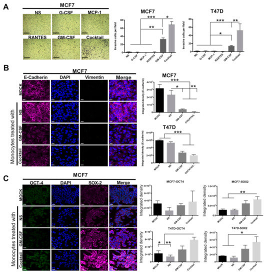 M1 macrophages have been largely considered antitumoral immune cells [38,39,40,41,42]. We have shown previously that triple-negative BRCA cells generated M1-like macrophages that displayed tumor-cooperating mechanisms [3,35,37]. To investigate whether the macrophages polarized with the proinflammatory cytokines also displayed these functions, we evaluated their capacity to coax aggressive features into luminal BRCA cells. In our previous work, we defined the triple-negative BRCA cells as aggressive because of their expression of stemness transcription factors (OCT4 and SOX2) and a mesenchymal marker (vimentin) and lack of expression of an epithelial marker (E-cadherin), and because they have invasive capacity [37,43,44]. We performed invasion assays with MCF7 and T47D luminal BRCA cells in co-culture with non-stimulated or cytokine-induced M1-like macrophages. We observed that GM-CSF- and cocktail-generated M1-like macrophages promoted invasion of the luminal BRCA cells (Figure 2A and Figure S2A), with M1-like macrophages formed with the cytokine cocktail exhibiting the highest efficiency compared with those induced by any of the cytokines alone (with an average of 68 and 52 invasive MCF7 and T47D cells per field, respectively). We then evaluated the induction of EMT and stemness markers by immunofluorescence imaging. We observed a partial EMT phenotype, with a significant decrease of E-cadherin expression but without an increase of vimentin (Figure 2B). We also observed increased expression of OCT4 and SOX2, particularly in M1-like macrophages induced with the cytokine cocktail (Figure 2C). Similar results were obtained with both MCF7 and T47D luminal BRCA cells. Images of experiments performed on T47D cells are shown in Figure S2A–C, and a positive control for vimentin expression is shown in Figure S2D. These data provide further evidence for the capacity of M1-like macrophages to promote features associated with aggressive tumors.