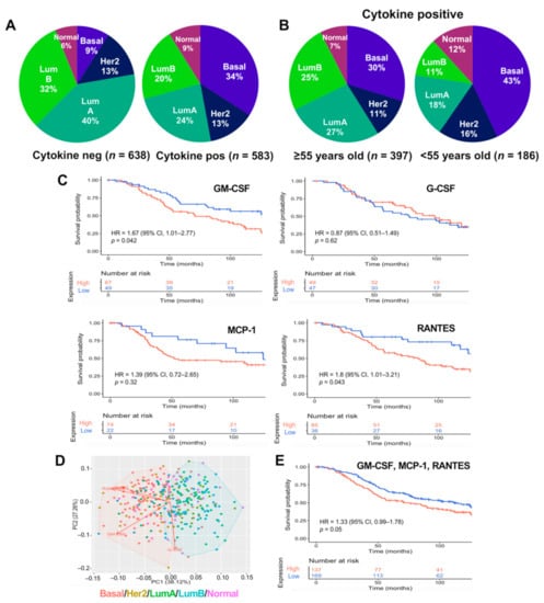 GM-CSF, MCP1, and RANTES are associated with breast cancer aggressive intrinsic subtypes and poor survival in patients above and below 55 years of age. (A) Proportion of patients overexpressing any of the cytokines by subtype. (B) Proportion of cytokine-positive patients as in A but with patients divided by age, ≥55 and <55. (C) Kaplan–Meier survival curves of patients (younger than 55 years old) with GM-CSF, G-CSF, MCP1, or RANTES overexpression. (D) Principal component and K-means cluster analyses considering data for the intrinsic subtypes and the four cytokines over-expression. Each subtype is represented by a different color, the clusters are represented in red (aggressive: basal and Her2-enriched) and blue (non-aggressive: luminal and normal) and arrows represent the loadings of the cytokines to PC1 and PC2. (E) Kaplan–Meier curves of BRCA patients under 55 years of age with GM-CSF, MCP1, and RANTES overexpression. A sample overexpressing one cytokine was considered when the cytokine showed a z-score >1. Pie charts compare overexpressing samples (cytokine pos) against the rest of the cohort (cytokine neg), while survival curves compare overexpressing (high) vs. underexpressing (low, z-score < −1) samples. Survival curves are a 10-year follow up. p-values were calculated using Log-Rank test and the hazard ratios (HRs) were determined with 95% confidence intervals (95% CI).