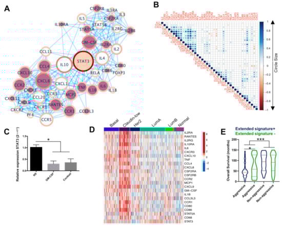 An extended gene expression signature associated with differentiation and polarization of M1-like macrophages is enriched in claudin-low tumors. (A) A protein–protein interaction network was generated using GM-CSF, MCP1, and RANTES as input. The size of the node and the color gradient at the border represent closeness centrality and betweenness centrality, respectively; the nodes filled with red or cream represent the genes with a significant positive and negative expression correlation, respectively; white-filled nodes were not significant. (B) Matrix of expression correlation of the interaction network components in the METABRIC breast cancer database, genes with a significant positive or negative correlation within samples were represented in blue and red, respectively, and the circle size and the color intensity are proportional to the Pearson’s correlation coefficient. Empty boxes are non-significant correlations (p-value > 0.01). (C) Relative expression of STAT3 in M1-like macrophages measured by RT-PCR. (D) Gene expression of the M1-like macrophage extended signature in patients younger than 55 years old. Heatmap was clustered by gene expression correlation and BRCA subtype. (E) Survival of patients divided by aggressive (basal, claudin-low, and Her2-enriched) or non-aggressive (luminal A, luminal B, and normal) subtypes and by the positive (samples with one SD above the median value of NES) and negative (samples with one SD below the median value of NES) occurrence of the extended signature. NES: Normalized Enrichment Score, SD: standard deviation. Data represent the mean ± SEM (standard error of the mean); non-parametric Kruskal–Wallis and Dunnett post-hoc tests, * p < 0.05 and *** p < 0.001.